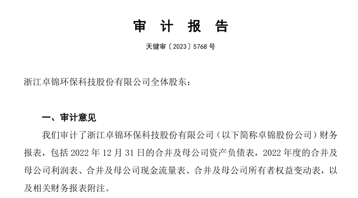 浙江卓锦环保科技股份有限公司2022年度审计报告