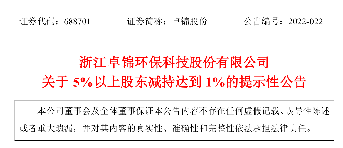 浙江卓锦环保科技股份有限公司关于5%以上股东减持超过1%的提示性公告