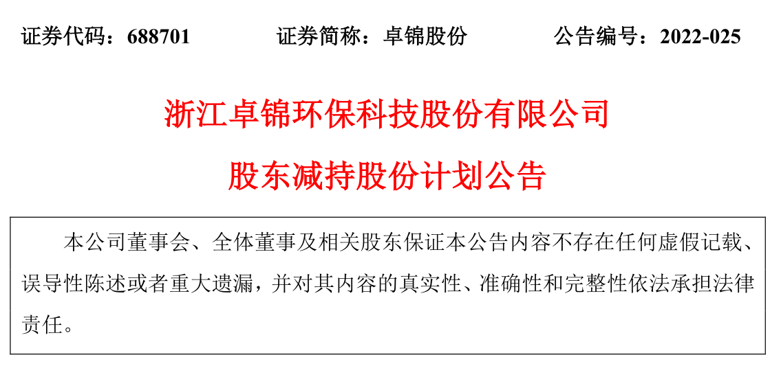 浙江卓锦环保科技股份有限公司股东减持计划公告