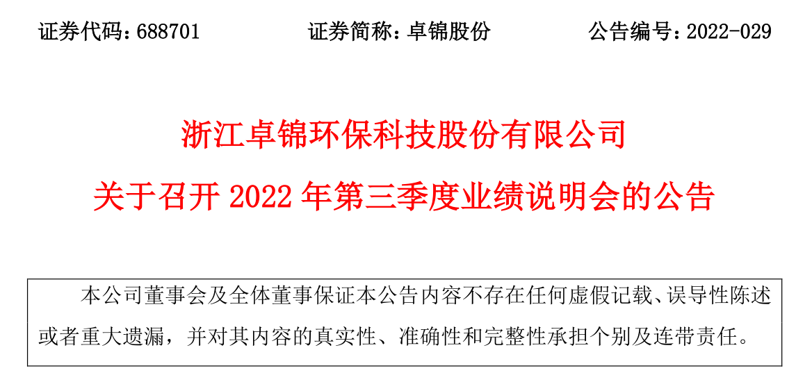 浙江卓锦环保科技股份有限公司关于召开2022年第三季度业绩说明会的公告