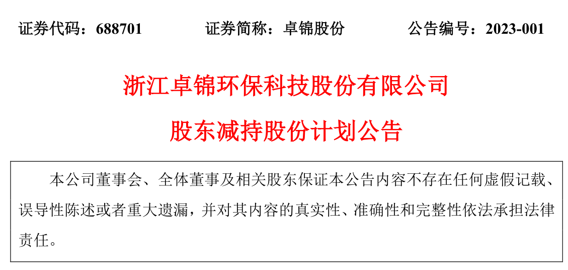 浙江卓锦环保科技股份有限公司股东减持计划公告