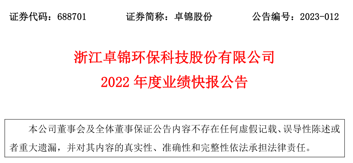 浙江卓锦环保科技股份有限公司2022年度业绩快报公告