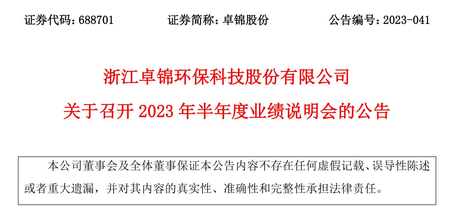 浙江卓锦环保科技股份有限公司关于召开2023年半年度业绩说明会的公告