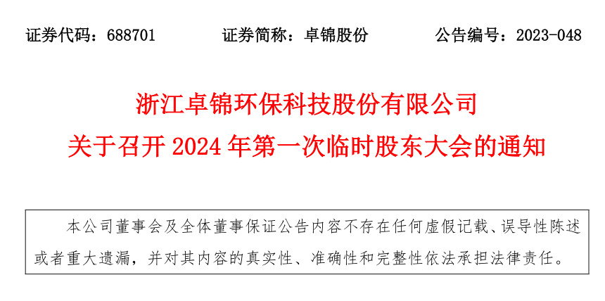 浙江卓锦环保科技股份有限公司关于召开2024年第一次临时股东大会的通知