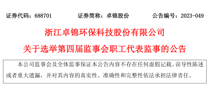 浙江卓锦环保科技股份有限公司关于选举第四届监事会职工代表监事的公告