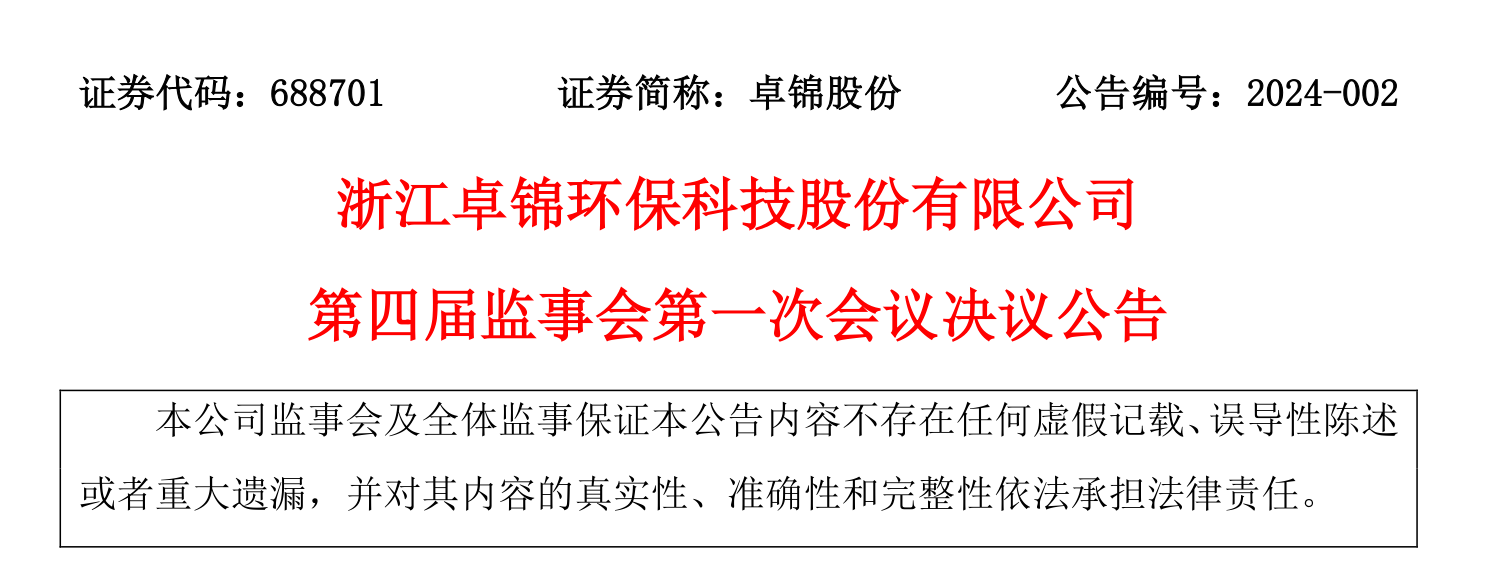 浙江卓锦环保科技股份有限公司第四届监事会第一次会议决议公告