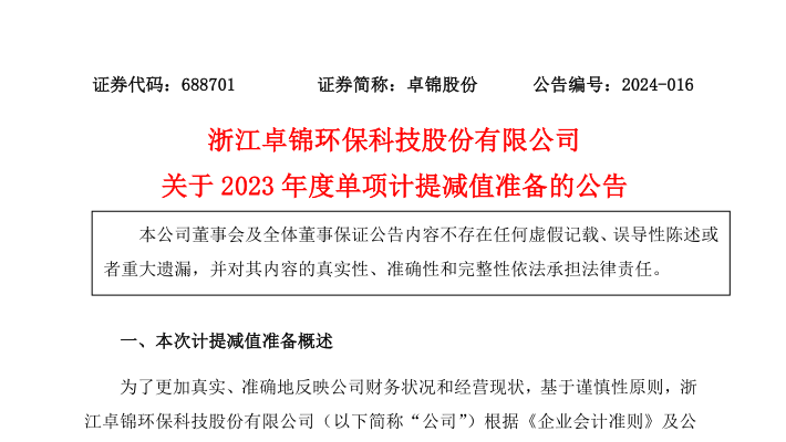 浙江卓锦环保科技股份有限公司关于2023年度单项计提减值准备的公告