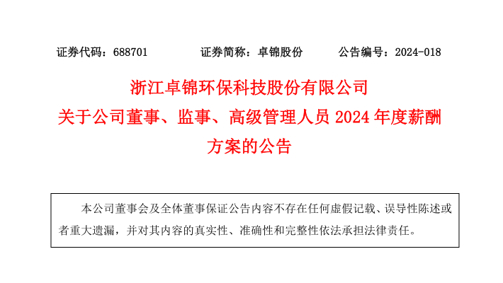 浙江卓锦环保科技股份有限公司关于公司董事、监事、高级管理人员2024年度薪酬方案的公告