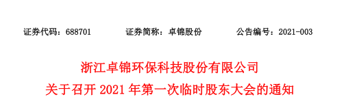 浙江卓锦环保科技股份有限公司关于召开2021年第一次临时股东大会的通知