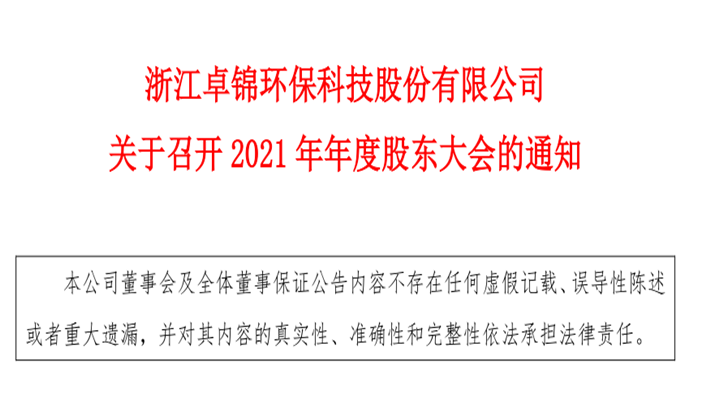 浙江卓锦环保科技股份有限公司2021年度股东大会通知