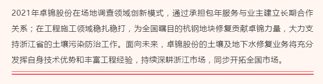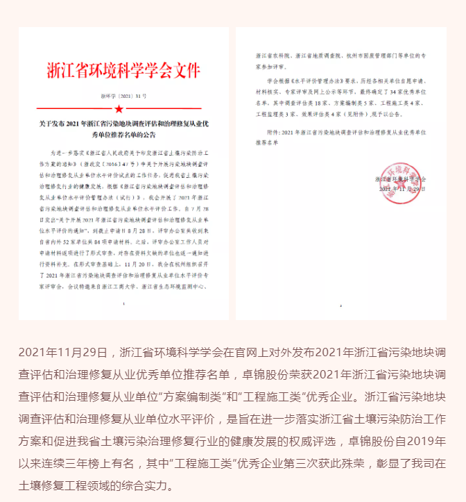 高度认可|卓锦股份获评2021年浙江省污染地块调查评估和治理修复从业单位“方案编制类”和“工程施工类”优秀企业